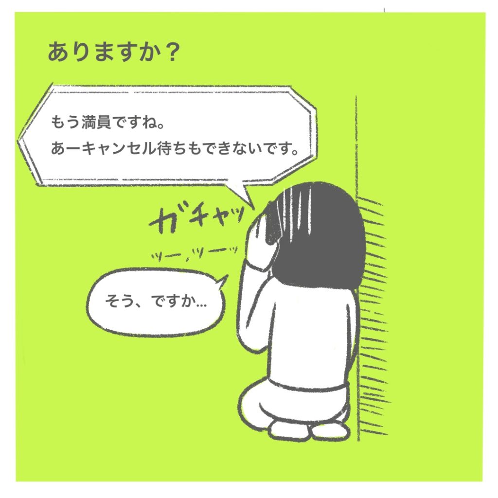 予定日を伝えたあと、予約はもちろんキャンセル待ちも即座に断られてしまいました😭冷たい対応に少し凹んでしまいました。